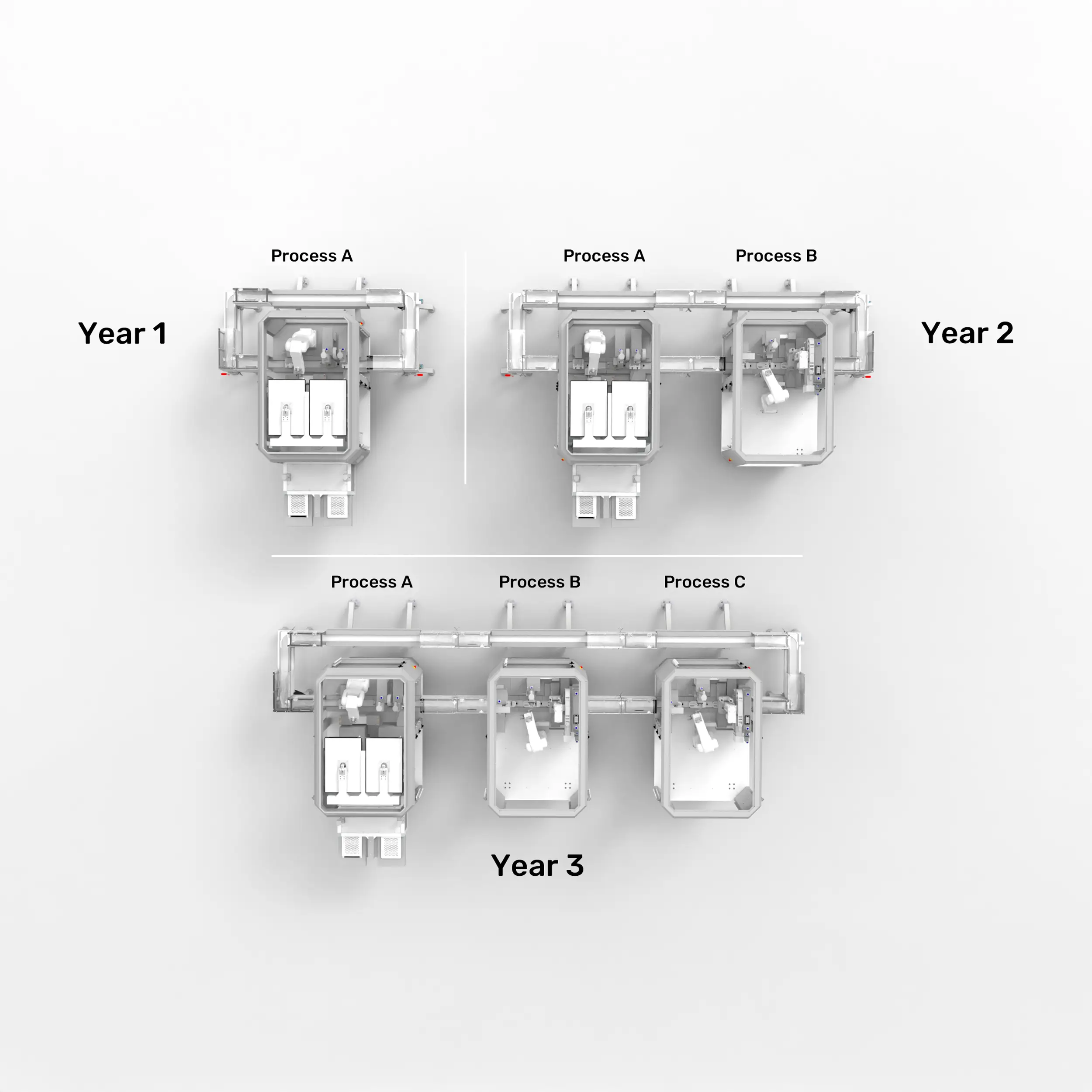 Future-proof your investment by decoupling your production capacity from a fixed setup. If your product pipeline changes or volumes increase, simply add new modules or reconfigure existing ones.