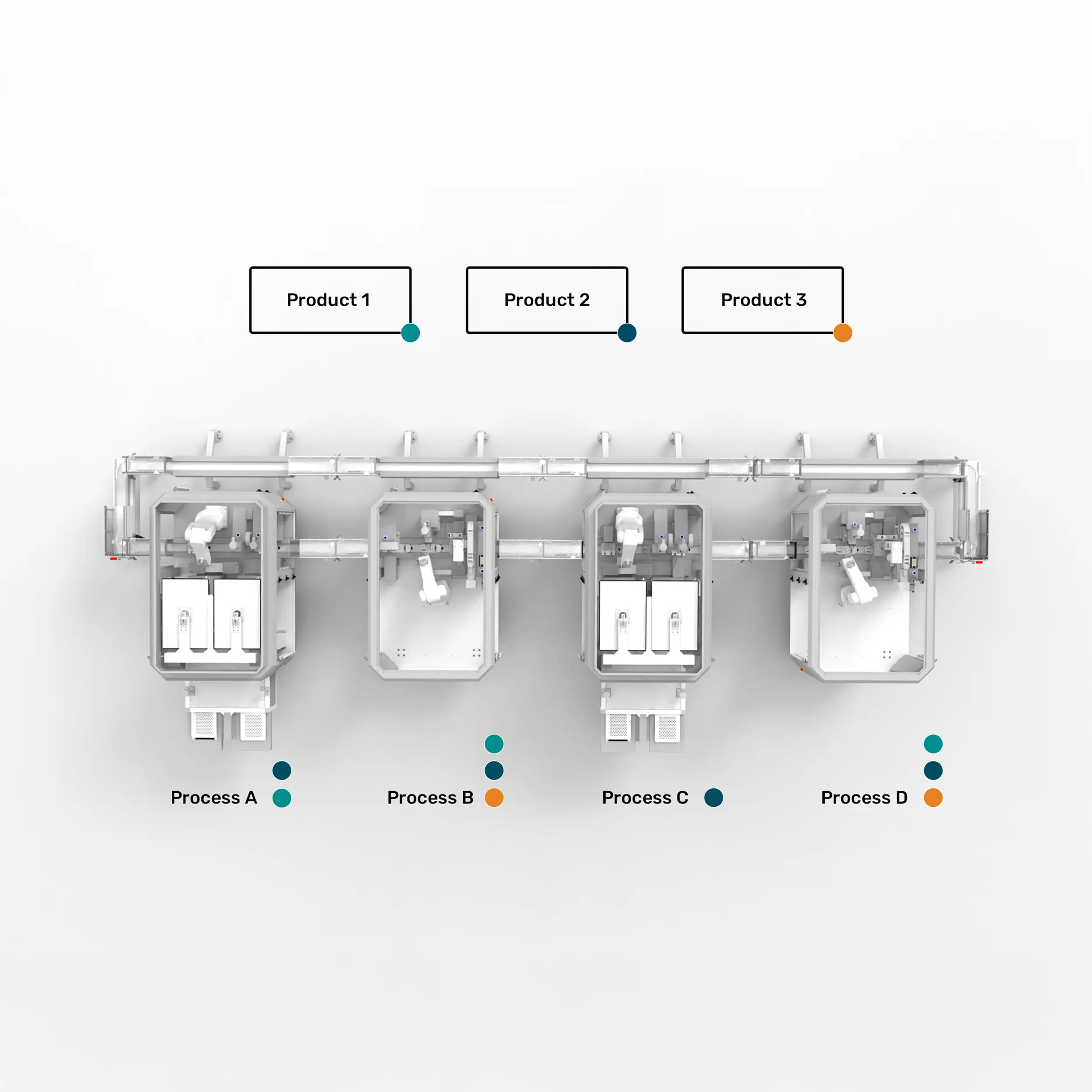 We replace rigid production lines with independent, standardized process modules. This architecture delivers unmatched flexibility and scalability, making it perfect for high-mix/low-volume manufacturing.